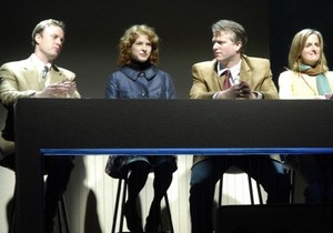 When octogenian Helen Santmyer's novel . . .And Ladies of the Club was published in 1982 it sold millions of copies and it's still in print, justly praised as a serious work of historic fiction. While the members of playwright Karen Zacarias's modern day book club discuss such substantive books as Moby Dick and War and Peace, the play itself falls into the more ephemeral category of a light summer read, its focus on keeping the laughs coming and any serious subtext under wraps. Light summer entertainment isn't necessarily a bad thing. Whether you're a book club member or not, seeing The Book Club on a lovely July evening makes it easy to give oneself over to its humor and forgive the failure to realize the pervasive book club scene's potential as a broader satire of its upper middle class participants' manners and mores. Given Nick Olcott's splendidly acted, stylish production (especially enhanced by Shawn E. Boyle's projections), you're also likely to buy into the play's stylistic conceit that the book club meetings you are witnessing are actually being filmed as a documentary; in other words, what you're watching is a play within a film. The filmic device, while ultimately too gimmicky, does add a layer of commentary on our voyeuristic world. On the one hand the awareness of being on camera puts the club members on their mettle to show off their literary smarts. Yet, it's evident that people quickly get used to the presence of the camera so that it in no way prevents the group's dysfunction from exploding. The chief personalities propelling the play's funny business are the book club's founding members. First on stage is Will (Tom Story), who guards his sexual preferences as carefully as the objects in the museum where he works. Next we meet Ana (Keira Naughton) who was once his girl friend and her husband Rob (C. J. Wilson), Will's erstwhile hunky college roommate— and the one member for whom the meetings are more about the pre-discussion dinners than the books (unless it's Son of Tarzan). While Will lays claim to having founded the club, it's the controlling and self-important Ana who dominates as the club's Queen Bee. She's brought Jen (Anne Louise Zachry), a bright but currently underachieving single woman into the fold, but only after Jen's career has run into problems as Ana's has moved forward. Ana also welcomes Lily (Cherise Boothe), a lively African-American woman as a means of introducing more diversity into the group. The Lily/Ana exchanges after the former has been "vetted" come closest to that unrealized broader satiric potential. The last to join this tight little literary circle is Alex (Bhavesh Patel). Good as all the actors are, Patel steals every scene he's in. He's also the one who blows the lid off the group's unity and prompts Ana to completely give in to her control freak tendencies. And, to cause further mayhem, there's a discussion of The Age of Innocence and more troublesome still. a book not to be found on any library shelf. Far be it from me to spoil things with more plot details. To further support the documentary setup, the club meetings are interspersed with commentaries by various expert/pundits — an NPR commentator, a Walmart manager, a drunken and frustrated writer, a former Secret Service agent, a Williams College co-ed and, best of all, a literary agent grumbling (not without justification) about too many books being published each year. All are hilariously portrayed by Sarah Marshall. All are brought into the amusing epilogue. Marshall's virtuoso versatility notwithstanding, at least a few would not be missed if eliminated, and thereby bring the play in without an intermission. On the other hand, R. Michael Miller's generic set, though suggesting a cocktail lounge rather than an apartment, efficiently serves the purpose of moving the meetings to different apartments without fussy scenery changes. BTF's artistic director Kate Maguire is to be commended for giving Berkshire theater goers a chance to see new plays instead of just time-tested revivals. Interestingly, the authors of both Pageant Play currently at the Unicorn and The Book Club Play have opted to explore two types of endeavors that are very much part of our current cultural zeitgeist, and do so with a focus on comedy. Both plays are far from perfect, but being handsomely produced and mounted with fine actors, gives their authors the much needed opportunity to perfect their craft. What would we do without regional theater? PRODUCTION NOTES The Book Club Play by Karen Zacarias Directed by Nick Olcott Cast: Cherise Boothe (Lily), Keira Naughton (Ana), Bhavesh Patel (Alex),Tom Story (Will), C.J. Wilson (Rob), Anne Louise Zachry (Jen(. Scenic designer: R. Michael Miller Costume designer: Laurie Churba Sound designer: J Hagenbuckle Lighting designer: Ann G. Wrightson Projection designer: Shawn E. Boyle Running Time: Approximately 2 hours with an intermission Reviewed by Elyse Sommer on July 13th From July 8 to July 19. Opens July 11.