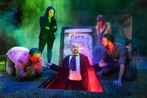 In The Amortalists' supernatural murder mystery, The Cheaters' Club, that purpose is indeed lurking. Amongst the trap doors, spirits and spells of this wild romp of a Southern gothic there's a larger commentary about the demons of race and sexuality in America's past and present. But in this production written and directed Derek Ahonen, those themes take a backseat to the fun, and the effect is that the story treads uncertainly between satire and tribute. Set in Savannah, Georgia, three siblings and their friend who compose the eponymous Cheaters Club arrive at the Chaney Inn with intent to commit adultery, as they've done annually for years. They couldn't have picked a worse place to stay. While Savannah is something of a tourist trap for ghost hunters, the Chaney Inn appears to be the real deal, a full-on haunted hotel with a murder in its past and secrets still unaired. It's staffed by the Chaney Family, an eclectic collection of quirky characters: the flirtatious lounge singer, Lana (Kelley Swindall), the deadly serious bartender, Lawrence (David Nash), the stoic bellhop, Lee (James Ree) and the no-nonsense matriarch, Mama (Sarah Lemp). There's an assortment of other characters passing through the Inn, including a wild-eyed practitioner of voodoo magic, a costumed ghost tour leader, and drunken frat boys. The Cheaters are quickly off to the races. Tommy (Matthew Pilieci) is the loudest of the bunch and most committed to getting laid. Vonn (Jordan Tisdale) is more apprehensive, while Jimmy (Byron Anthony) is hard-pressed to find a fellow gay man with which to exercise his infidelity. Cathy (Cassandra Paras), meanwhile, becomes caught up with dramas back at home. Mostly though, it's a rollicking good time of excessive drinking and bad behavior all around, punctuated by the occasional moment in which the sexuality or race of various characters come to the fore. But there's clearly something amiss at the hotel, particularly in the forbidden Room 305. Naturally, the Cheaters end up caught in the mess. And when the barriers between the natural and the supernatural come tumbling down, the past literally comes colliding with the present. That's when things get pretty silly. There's body swapping, finger eating, and spell casting, and the laughs here merit the ridiculousness of the situation. With a cast of 26, it's a tribute to Ahonen that the stage never seems crowded or the plot overstuffed. He's created a large universe for the play, but one that coheres to serve a singular narrative. The Amoralists and their guests are a talented bunch, and there are a number of excellent performances. Zen Mansley stands out for bringing the seedy, second-hand magic of ghost tour guide Vladimir Anton to showy life. Hair gelled and sporting a Yankee's swagger, Matthew Pilieci is perfect as the insufferable ringleader of the Cheaters. And Kelley Swindall brings out all the stops as the combative, hard-drinking Lana. For a company that prides itself on complexity and which often warrants its over-the-top plots with heart-felt, emotional centers, The Cheaters Club comes up short. There's a message here, about how, when it comes to social progression, as one character puts it: "Everything's as it always was. It just looks a little different." But theatergoers are more likely to leave the Abrons Arts Center talking about Alfred Schatz's multi-level set, Stephanie Cox-Williams' special effects, or the sheer spectacle of seeing 26 actors on stage than the modern state of marriage or race relations. The Cheaters' Club may be great popcorn fare, but it is not the stuff of particularly resonant or powerful theater. The overall experience is like that of a haunted house — flashy and full of thrills, but mostly smoke and mirrors.