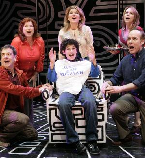 Each of William Finn's two one-act musicals, March of the Falsettos and Falsettoland, had successful runs Off Broadway. In 1992 they were combined under the umbrella title Falsettos and produced on Broadway where they were lauded for contributing to the continuing sophistication of the American musical. Here we are 15 year later and the George Street Playhouse is reminding us just how marvelous is this musical's savvy melodic language and how easy it is to respond warmly again to the witty libretto (co-authored by James Lapine) that addresses some pretty complicated dramatic issues. By the intermission we realize how protective and concerned we are becoming about the small group of voracious but unremarkable characters. By the show's end we realize how much we have let ourselves become involved in their lives and their loving. Director David Saint's briskly staged, whimsically conceived production returns us to that benign pre-1980s of recklessly ego-indulged sexual preference, as well as to the beginning of a tremulous, death-harboring new decade. But, if Falsettos is no somber message musical, what is it? It is a wildly funny and frenetic fusion of an unorthodox urban family's life. It is also a musical of life-styles and life cycles. In fact, style is at the fore in this production artfully designed to suggest life as a black and white maze by Beowulf Boritt. The abstract scenic design is repeated in the furnishings, all of which are on rollers allowing for speedily executed changes in locale, as humorously engineered by the cast. Color finds its way into the scheme of things via topical posters and designer Amela Baksic's 1980s apparel. The story of Marvin, a married homosexual and that of his wife, his son, his psychiatrist, his lover and even the nice lesbians who live down the hall, may shock some of you. However, it is so courageously and joyously convoluted as to effect a surprise and a laugh with almost every musical minute. Finn's delightfully savvy musical jet propels each and every one of its idiosyncratic characters through an ingeniously harangue-filled terrain. While attempting to tread, as well as understand, the egocentric but oddly likeable Marvin (Michael Winther), who wants out in order to live with his male lover Whizzer (Colin Hanlon), the winningly neurotic psychiatrist Mendel (Mark Nelson) discovers that he is suddenly falling in love with Marvin's wife Trina (Liz Larsen). Noticeably disturbed by the sudden change in partners is Marvin and Trina's son Jason (Malcolm Morano), an otherwise wise and resilient 11-year old. Jason finds himself hurtled into analysis himself and into a situation he must face with a hastened maturity. Just as Act 1 whizzes along its wacky course, a sobering mist envelops Act II. We first hear about the AIDS epidemic from the family friend and lesbian doctor (Anne L. Nathan). We get the first tremor of things to come as she shares her fears about the disease ("something bad is happening") with her lover (Sarah Litzsinger), a ditsy caterer at work perfecting nouvelle Bar Mitzvah cuisine. The year is 1981. Marvin has broken up with Whizzer, Mendel is living with Trina, Jason is preparing for his Bar Mitzvah and an epidemic touches their lives. Falsettos has its time of sadness, but this is outweighed by the witty and bright bitching that Finn has set to some really wonderful music. The cast is uniformly strong. Winther, who made a splash Off-Broadway for his performance in Songs From an Unmade Bed, is unassumingly effective as the conflicted Marvin, whose ideas of a happily extended family are not immediately shared by the others. As Trina, Larson deploys a gamut of emotions to considerable effect, giving Trina her defining moment singing the hilarious angst-driven singspiel "I'm Breaking Down" in which she literally does just that. Nothing could restrain the audience from cheering its prolonged approval. The comely Hanlon and vivacious Litzsinger are reunited, if not paired romantically again on the George Street stage after playing the leads in The Last Five Years, a few seasons back. The 13 year-old Morano, who has appeared on Broadway in How the Grinch Stole Christmas, and Chitty Chitty Bang Bang, is no less a therapy-seasoned trouper than the three older males. Holding center stage is not an issue for Morano who invests more than just the lyrics into the musically complex arias "My Father's a Homo," and "Miracle of Judaism." He manages to top himself in a solo game of chess in which his speedy moves are timed to keep up with a table he keeps spinning around. The character of Mendel, the by-love-possessed psychoanalyst is earmarked for neurotic shtick but has a poignant layer that Nelson mines with both broad humor and when necessary subtlety, as in "A Marriage Proposal." You won't find a wrong note in this Falsettos. LINKS Falsettos Berkshire summer production--includes song list Falsettoland NATCO/ - National Asian American Theatre Company production