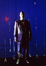 We all know quite well of the ephemeral nature of performance, of those irreplaceable moments during which forces come together to produce the truly astonishing and wonderful. But we think quite a bit less about the fleeting nature of the underlying art, of the limited opportunity that exists for the forces that must coalesce in order to produce that play, or symphony... or opera. That's the concern of this new work, confronted in its most brittle instance. Life imitates art all right, and the parallels between this play and Moby Dick are as unmistakable as they are plentiful, thoughtful and intricate. Nathan (Rinde Eckert), endearing piano tuner and would-be opera composer, has to contend with two whales every bit as formidable as the one that torments Ahab. He is trying to write an opera based on Moby Dick; he's also fighting the progressive deterioration of his own memory. A set of tape recorders -- color coded as to purpose and one of which is permanently hanging around his neck -- provide the footprints his mind must follow each time it's forced to retrace. The tape is also a sort of benchmark, devastatingly playing on longer and longer as his mind requires more and more information to reäquaint itself with where it has been. Nathan is also served by a muse (Nora Cole) who cajoles his attention to his urgent work. Though in his mind, this muse (his tape tells him) is infallible. Inspired by an opera singer who gave up her classical career, we learn (elsewhere) that the muse also embodies many of Eckert's own notions about, among other things, the grandiosity of opera. And God Created Great Whales may not be as grand as opera, but it is stunningly beautiful. Eckert works in a style that certainly falls in the category "experimental," but the shards of Melville's classic he feeds us are more (hopefully familiar) glimpses than deconstructions. Nathan may look like a mess, with his tape contraption tethered to his body with duct tape, but when Eckert -- his large dome-topped frame revealing every tumbling nuance of Nathan's frustrations -- lifts his fine tenor voice in song, our attention is turned sharply from what we see to what we hear. Ms. Cole, too, fills the air with exquisite sound. Eckert's music is eclectic -- he often accompanies himself on the piano that occupies a fair share of 45 Bleecker's wide stage -- but increasingly glorious in its presentation. More beauty still is achieved by Kevin Adams, whose set/lighting design, hard to adequately describe and only vaguely revealed in the picture above, is a masterpiece. Dozens of raw light bulbs adorn the stage and transform it into Nathan's veering mindscape. At times, this beauty is matched by intensity, but gaining a firm grip on that force often eludes Eckert. His storytelling cannot adequately hold us. There is much here of interest to lovers of the book, still more for opera fans and those inclined to ponder its creative process. But while Ishmael spins Melville's often convoluted yarn over a myriad of chapters, theater does not allow such luxuries. Neither Eckert nor his director, David Schweizer -- whose work is worthy of many praises -- find a way to keep us on Nathan's path: something visceral is lost. This is a very pleasurable experience, but less compelling than it might have been.