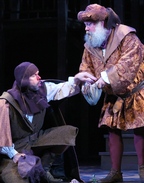 Under the sterling direction of Joseph Discher, the play has the effect of flying by or rather catapulting by. Not an insignificant feat considering that the Bard's language, the complex history that propels the text and the confluence of so many dynamic events and characters require our most dutiful concentration and focus. I am rather glad that the added complexities that are expanded upon in Part Two have not been attached (as they have often been), although an added hour or two given the excellence of this company would not have been ill-advised. That the entire production proves to be sheer pleasure from start to finish can be attributed in equal parts to the rousing performances and to the striking design of Jonathan Wentz's spectacular all wood tiered unit setting: the steep central staircase buttressed on both sides by archways, balconies, wall coves with flaming torches and the remnants of a battered stone wall is quite spectacular and atmospherically enhanced by lighting designer Matthew E. Adelson. The mostly gold, red and blue palette used by costume designer Paul H. Canada adds richness to the production. Notwithstanding an opening tableau vivant showing Prince Hal (Derek Wilson) having a robust sexual dalliance with an unnamed wench, this is as fine a reflection of the source material as anyone could ask for. I am probably not alone in thinking that Henry IV, Part One is Shakespeare's most deliberately entertaining history play, made more so by Discher's clear vision and his clever staging of the battle scenes (a balance of slow motion and real time). With all due respect for the prescribed savagery that infiltrates the text, it is the ease that the cast has with the text that deserves the most praise. It is always a plus to have so many gathered in Shakespeare's name rendering his blank verse with intelligence. Don't kid yourself into thinking that our hearts and minds should be focused on the title character, as we are instead unwittingly manipulated to care more about that "irresponsible liar without malice, lover of wine, women and song" Sir John Falstaff, who could not be getting a more formidably endearing portrayer than John Ahlin. That Ahlin, who is in his fifth season with the STNJ, has embraced that "huge hill of flesh" with more conspicuous pretensions than I have seen before, even hiding behind a wondrous full white beard. I am in his debt for bringing Falstaff's delectable wit to the fore, leaving us to instantly forgive his misguided morals. Would that Falstaff should always be seen through the lovably pathetic, villainous and vain posturing that Ahlin brings to the role. Considering how Falstaff is famously known as one of the greatest comic figures in dramatic literature and made more so by Ahlin's memorable performance, he plays a rather unimportant role in the scheme of things. As Falstaff reigns over the lowlife and bawdy world, recklessly influencing the young Prince Hal (played by Wilson with low-keyed brio), it is the high-life and intrigue of the duplicitous political world of King Henry IV (Brent Harris), Lord John of Lancaster (Cliff Miller), Hotspur (a strikingly robust performance by Jon Barker), among others who spin the subtle shifts of power. The wives don't figure importantly in the plot but Jessie Graham shows us the feisty side of Mistress Quickly, whose tavern is the center of much of the action. This play's major conflict is between a King and his rebellious heir while the unjustly gained kingdom is threatened by a Welsh rebel force. While the pomp and circumstances of the royals, the typical family issues and feuds thatalso include those of Hotspur and his father Thomas Percy (Conan McCarty) are clearly 15th century England, they will resonate with a disturbingly familiar ring to those who pay attention to our own recent history.