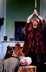 The light-hearted story about a tour guide at one of England's architecturally and historically least interesting stately mansions who is fired by an uptight Preservation administrator for indulging her penchant for using her imagination to give Fustian Manor the pizzazz it lacks. With the underlying attack on mediocrity to give heft to this light confection, the play has had numerous regional revivals. But none have found an actress or setting as ideally suitable as Tina Packer and Shakespeare & Company's Springlawn Mansion, or a director to take advantage of the site specific possibilities of the venue. Packer is a solidly trained, witty actress and listening to English roll off her tongue is always a pleasure. Though she doesn't quite fall into Smith's category of actresses who could draw crowds reading the telephone book, she is a delightful Lettice. As the visionary who founded Shakespeare & Company, she has much in common with her character's mother who also founded a Shakespeare Company outside her native England (in the play the company is located in France) and instilled Lettice with the motto "enlarge, enliven, enlighten." As this marks a rare long-term acting role for Packer, this amusing farce should help to shore up he r Company's dangerously depleted financial resources. The production's uniqueness reaches its peak during the first twenty-five minutes when the audience is directed to the seats placed at the foot of Springlawn entrance hall's curved wooden staircase. (A caveat: there aren't enough seats for everyone so if you don't want to stand, get out of the theater and grab one of the chairs fast). With the audience and other members of the cast serving as her audience, the irrepressible Lettice then takes us through three distinctly different and increasingly more dramatic histories of Fustian House. The last is interrupted by the outraged Lotte Schoen (Diane Prusha) who summons Lettice to appear in her office. The audience then moves back into the "regular" theater for that fateful meeting. Though the prim and proper administrator is not to be swayed from her decision to dismiss the unconventional tour guide, it turns out that Lettice has unleashed the romantic and quality-starved spirit inside her bureaucratic exterior. Thus, unlike other Shaffer plays where the mundane spirit gains dominance over the creative spirit, Lotte is conscience stricken and visits Lettice in her theatrical prop filled apartment to offer her a chance at another job. Lettice and Lotte become friends -- abetted by lovage (a concoction made from a European herb with which Lettice flavors the drink she serves the at first reluctant Lotte. Before the happy ending that, besides uniting the two lonely spinsters, satisfies their mutually shared disdain of mediocrity, there's a misunderstanding that almost lands Lettice in jail. Despite the warmth of the characterizations and the theme which adds substance to fun and witticisms, this confection hardly supports three hours. As director Holdrridge felt free to add updated references (as when Lettice suggests putting details about Lotte's plan for an "Eyesore Negation" tour on the internet), she should have felt free to trim some of the soliloquies in order to get to the curtain calls at least a half an hour sooner. b Though Diane Prusha is competent enough as Lotte, this is clearly Ms. Packer's show. Catherine Taylor-Williams and Andrew Borthwick-Leslie are fine as Lotte's assistant Miss Framer and Lettice's court appointed lawyer. Not to be overlooked is one non-speaking performer, Tina Packer's own furry friend as Isis, the cat.
