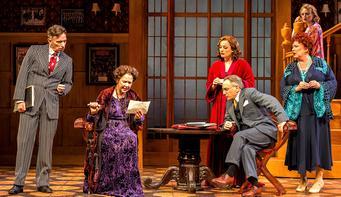 Taking place in 1927, the acting family is led by the grand dame Fanny Cavendish (Harriet Harris) and her offspring: Broadway star Julie (Laura Michelle Kelly), who regrets giving up her lover from 20 years ago to remain on the stage . . .and Tony (Will Swenson), an alcoholic, scandal-ridden actor who has deserted the stage for Hollywood and now wants to avoid arrest and dicover his spirituality. . . . Julie's daughter Gwen (Hayley Podschun) who is torn between acting and being "normal." Hovering over all of them is the late, great Shakespearean actor, Aubrey Cavendish, whose life size portrait hangs in a place of honor in the living room, as the measure of their theater, therefore life, success. The family is in the midst of making life-altering choices. The show based on the renowned acting family the Barrymores, is a love letter to the theater;but it's a letter that needs some editing. The first song, "Just Another Regular Night/Listen to the Beat" sets a terrific tone, with Kelly leading a dynamic singing/dancing chorus in a rousing salute to Broadway production numbers. If the rest of the show could have maintained the energy and focus of this routine it would be in good shape. Swenson makes his grand entrance with a razzle-dazzle number "Too Much Drama in My Life" that becomes much too busy and broad. The first act feels prolonged and has an anti-climactic closing which is dramatically effective but feels tacked on. The opening of act two is a broad, shtick-y number, "Avaunt, Avaunt" that doesn't move the plot forward though it stars Fanny's brother Bert (Arnie Butler) and his wife Kitty (Kathryn Fitzgerald,) the two clutzy non-talented members of the family. This act moves better with moments of effective drama, and, as in most early 20th century plays, all problems and conflicts are solved. Harris's Fanny Cavendish has the carriage and mien as the family's doyenne to establish an imperious attitude enhanced by myriad bon mots some of which are hysterical throwaways. Her philosophy is delineated in "Stupid Things I Won't Do," such as read a newspaper (except for the reviews) and lead a normal life. Podschun's Gwen is being courted by stock broker Perry Stewart (A. J. Shively) who wants her to leave the stage. Their scenes and numbers, especially "Baby Let's Stroll," are charming. Kelly has a splendid voice but when she sings in her higher register she is difficult to understand. This sometimes occurs in her dialogue delivery. Swenson is larger-than-life as Tony, but he seems to channeling the pirate king from Barrington's in which he excelled a couple of years ago. Even though he brazenly overacts, his tongue-in-cheek exudes the charm of a self-proscrbed rascal. Alan H. Green plays Gilbert Marshall, Julie's long-separated love, with a strength and a voice that fills the theater. Bert and Kitty supply much of the low comedy in comparison to the wit of the others. Chip Zien nicely rounds out the principals in the cast as Oscar Wolfe, who has been the family's patient and tolerant manager for decades. Director John Rando and choreographer Joshua Bergasse have worked together on several shows at Barrington Stage as well as on Broadway. Rando has tried to keep the action moving but he is somewhat inhibited by Rachel Sheinkin's book. He employs frequent slapstick moments to offset some of the lengthier dialogue scenes. Bergasse's dance numbers, the ensembles and the duets, especially "Baby Let's Stroll" are over too soon. William Finn's score is a varied medley of big Broadway numbers, charming and character-driven solos, and a number of comic pieces. The set designed by Alexander Dodge is flexible with scenery dropping in from the flies, rolling onstage from the wings and furniture placed by ensemble members who are efficient and unobtrusive. The major setting, the Cavendish home, is beautifully decorated reminiscent of the 1920's. As effective as the sets are the costumes of Alejo Vietti are absolutely stunning and detailed which evoke the pre-Depression era and suitably define the various characters. This is defined as a world premiere but it needs some work to tighten it up. On the other hand, if you know and love theater and enjoy energetic dance numbers, some over-the-top acting and a melodious score, you will enjoy The Royal Family of Broadway.