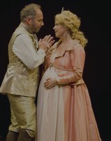 In its long history, Shakespeare & Company has done this part tragedy, part romance just once before, that one a Bare Bard production in its old home at Edith Wharton's estate, The Mount. Typical of everything at the beautiful Elizabethan hued Founders Theater, the current production is still not heavy on scenery, but what we have is apt. But the lack of scenic bells and whistles is more than compensated for by a cast that includes the welcome return of Jonathan Epstein giving his as usual convincing all to the unreasonably, pathologically jealous King Leontes, and Corinna May as an especially powerful Paulina. Also making casting news is Elizabeth Aspenlieder who's quite moving in her first role as a tragic heroine, Queen Hermione. This ill-fated queen is said to be patterned on Anne Boleyn, the victim of another despotic and unhinged husband, King Henry the 8th. Add to these and other fine casting choices the luscious costumes by Kara D. Midlam and Susan Dibble's enjoyable choreography, and this is indeed a summertime treat that's likely to lift the onus of "lesser Shakespeare" from this late entry in the Bardian canon. In case you're unfamiliar with the admittedly bizarre plot, it's not hard to follow even without reading the program's helpful synopsis. In the first and darker part of the story we see the Sicilian King Leontes metamorphose from welcoming to aggrieved host to his best friend the King of Bohemia (Shakespeare veteran Jonny Lee Davenport), and accuse him of fathering his wife Hermione's about to be born child. It's a casebook example of good sense gone inexplicably berserk. But the absence of believable motivation for Leontes' sudden and quite insane jealousy makes for a compellingly melodramatic shift from a gay, tranquil kingdom to a grim wintry landscape where we watch the paranoid monarch alienates himself from everyone he cares about. The wife he loved is destroyed, his beloved young son dies which insures that the redemption cannot come easily or in a hurry to the finally repentant King. Leontes' ill-advised actions turn his kingdom into a gray place, Shakespeare rolls out a magical carpet to whisk us to what is essentially a second play. This one is set in the bucolic land where the baby girl the jealousy crazed King refused to accept as his own is discovered and raised as the daughter of a kindly Shepherd (Malcolm Ingram excelling in this as well as several other roles) and sister to his son (a very able and physically adept Wolfe Coleman). Without a zapper but with an assist from Scott Renzoni's Father Time, Shakespeare fast forwards his melodrama by sixteen years. He now immerses us in a fairy tale romance revolving around the grown up Perdita (a fetching Kelly Galvin) and Florizel (Ryan Winkles) who is (to noone's surprise) none other than the son of King Polixenes, whose overly long visit to Sicilia ended with his nearly getting himself killed by getting too friendly (though innocently so) with his host's wife. In the 16-years later story we also meet one of Shakespeare's most outrageously funny clowns, the slippery-fingered roguish peddler Autoclycus (played with great relish by Jason Asprey). The villain of this romantic half of the play is Polixenes — well, sort of , in that he's not about to have his son marry a shepherd's daughter. His disguising himself at a Shepherd's celebration and putting the kabosh on the young lovers' nuptials. But not for long. This is all a set-up for young love to triumph and redemption to finally lift the shadow hanging over the Sicilian kingdom and king. Oh, and while the adorable Parker Bell-Devaney (the young Prince Mamillius at the performance I attended) doesn't have a big part, he deserved the big hand he got at curtain call time —, as did the entire ensemble of this lyrical, oh-so-sad but full of fun two-in-one fantasy. Production Notes The Winter’s Tale By William Shakespeare Directed by Kevin G. Coleman (Founders’ Theatre, Shakespeare & Company, Lenox, Mass., $14-$85) A Shakespeare & Company production in two acts Cast: Elizabeth Aspenlieder (Hermione), Jason Asprey (Autolycus/ Court Officer), Wolfe Coleman (Young Shepherd), Heather Coulter (Shepherdess), Johnny Lee Dav enport (Polixenes), Jonathan Epstein (Leontes), Leia Espericueta (Dorcas/Gentlewoman), Kelly Galvin (Perdita), Dana Harrison (Mopsa/ Emilia), Malcolm Ingram (Archidamus/Gaoler/the Old Shepherd), Shea Kelly (Gentlewoman/Shepherdess), Corinna May (Pau/lina/Sheperdess), Josh Aaron McCabe (Camillo), Scott Renzoni (Antigonus/Time;/Shepherd), Douglas Seldin (Dion/ Mariner/Shepherd), Enrico Spada (Cleomenes/Shepherd), Andy Talen ( Rogero/Shepherd), Ryan Winkles (Florizel/Sicilian Doctor), Colin Young and Parker Bell-Devaney (alternate as young Mamillius) Set and Props: Patrick Brennan Costumes: Kara D. Midlam Lighting Les Dickert Composer: Bill Barclay Sound: Michael Pfeiffer Fight Choreographers: Kevin G. Coleman & Ryan Winkles Dance Choreographer Susan Dibble Voice and text coaches: Leigh Smiley and Clare Reidey Stage Manager: Diane Healy From July 15- September 5, 2010 Reviewed by Elyse Sommer at July 23rd Press Opening Women of Will